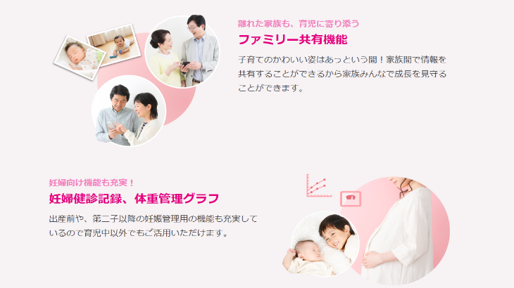 子どもの体重や思い出の写真をかんたんに記録・管理し、家族間で共有することが可能です。