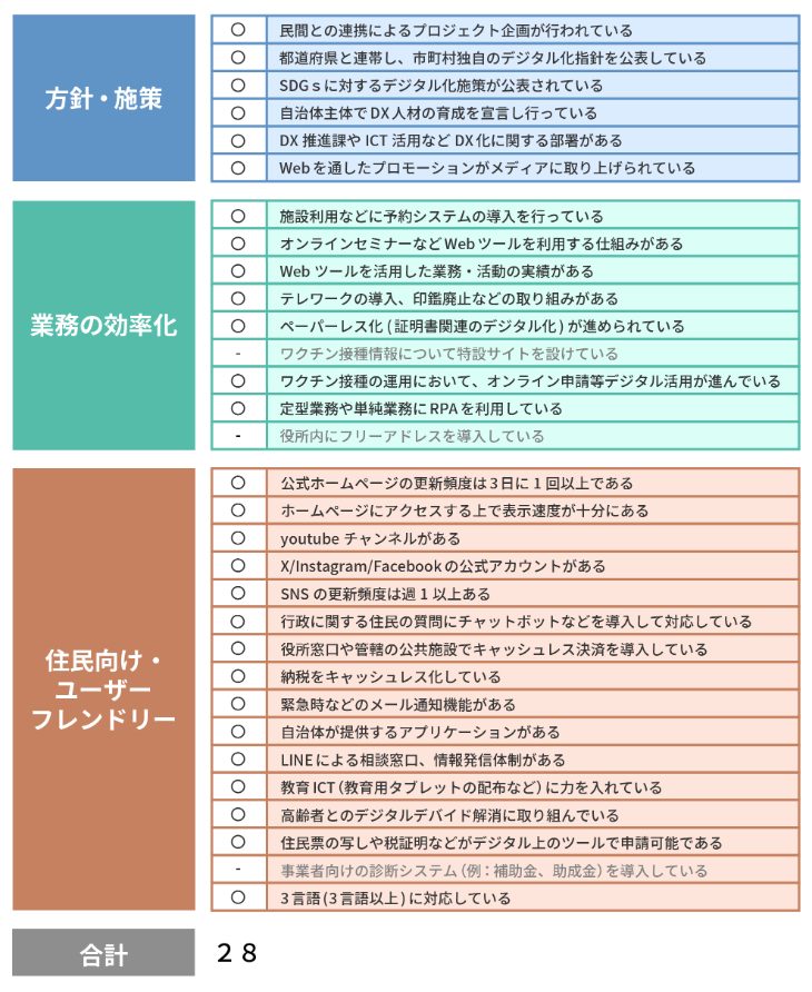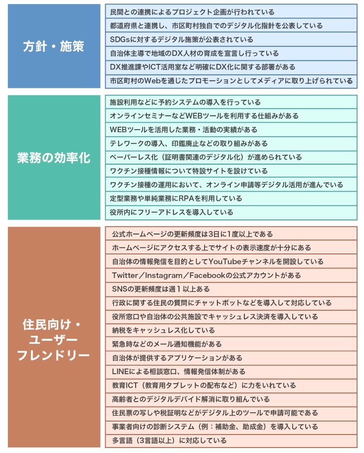 DX化として重要な観点となる住民向けの取り組みで、行政の手続きや情報発信においてユーザーフレンドリーになっているか、あるいはICT教育、デジタルデバイドの解消など住民がよりよく暮らせる取り組みがなされているかを評価しました。