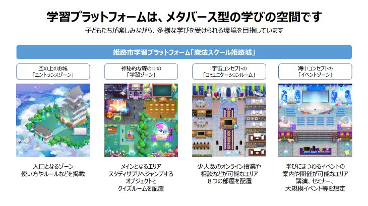 姫路市は2025年(令和7年)1月より、メタバース型の学び空間「姫路市学習プラットフォーム」のサービス提供を開始しました。同サービスは、学校に通うことが難しい児童を含めたすべての子どもたちへ学びの機会を提供し、教育機会の均等化および基礎学力の向上を目指しています。